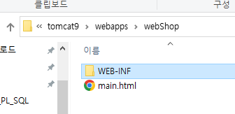 (9) 압축을 해제한 webShop 폴더를 확인해 보면 이클립스에서 생성한 WEB-INF 폴더와 main.html 파일이 보인다.
