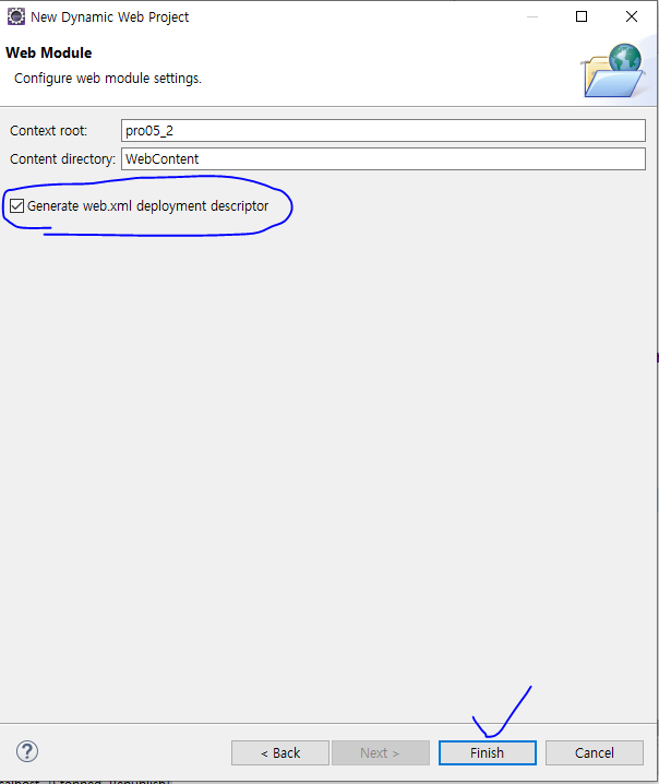 4. Generate web.xml deployment descriptor 옵션의 체크박스에 체크한 후 Finish를 클릭한다.