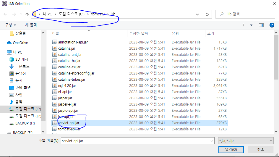 7. CATALINA_HOME(톰캣 루트 디렉터리)의 lib 디렉터리에 있는 servlet-api.jar을 선택한 후 열기 클릭