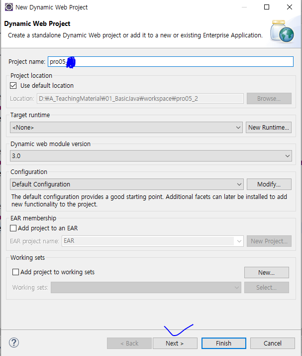 2. 프로젝트 이름을 pro05로 입력한 후 Next를 클릭한다.