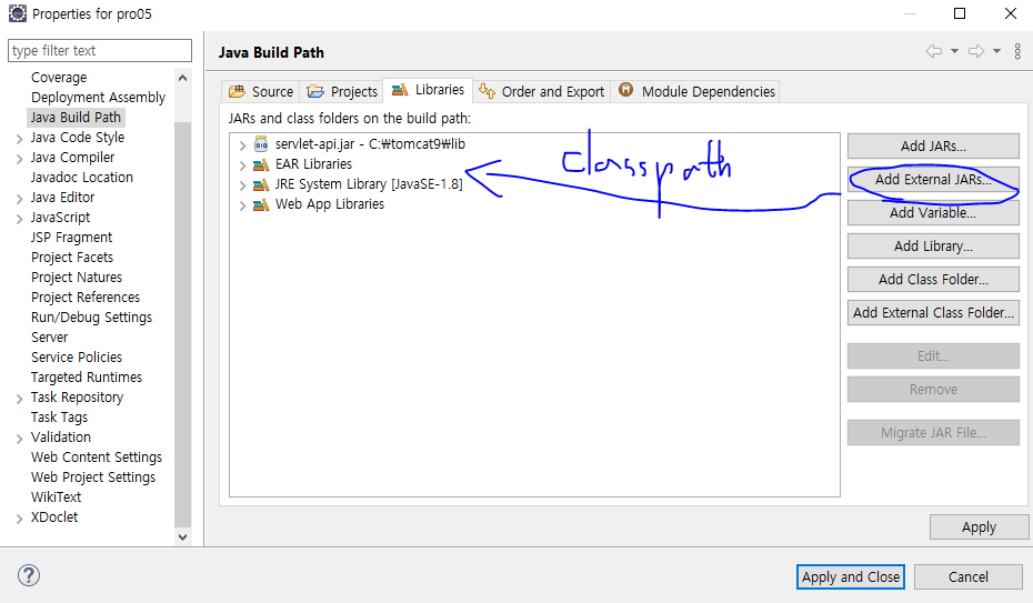 8. servlet-api.jar의 클래스 패스 설정 확인 후 Apply and Close를 클릭해 종료한다.
