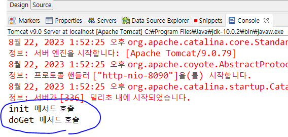 * 서블릿도 자바 클래스이므로 실행하면 당연히 초기화 과정 그리고 메모리에 인스턴스를 생성하여 서비스를 수행한 후 다시 소멸하는 과정을 거친다. 이런 단계를 거칠 때마다 서블릿 클래스의 메서드가 호출되어 초기화, 데이터베이스 연동, 마무리 작업을 수행한다. 각 과정에서 호출되어 기능을 수행하는 메서드들이 서블릿 생명주기 메서드이다.