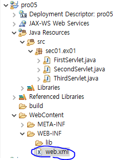 (1) pro05 프로젝트의 WebContent > WEB-INF 폴더를 클릭한 후 web.xml을 선택하여 엽니다.
