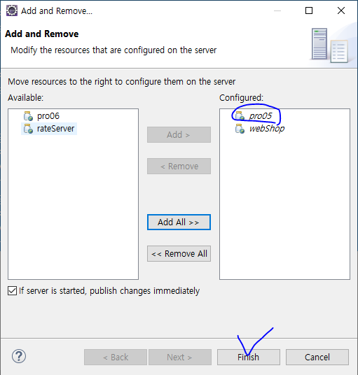 (2) pro05 프로젝트를 선택한 후 Add를 클릭하여 추가하고 Finish를 클릭한다.