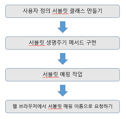 * 이번에는 사용자 정의 서블릿을 실제로 만들어서 서블릿의 동작 과정을 실습해 본다.