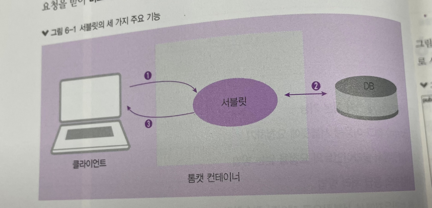 * 다음은 서블릿이 수행하는 세 가지 주요 기능이다. 요약하면 클라이언트로부터 요청을 받아 비즈니스 로직을 처리하고, 그 결과를 다시 클라이언트에 돌려주는 과정이다.