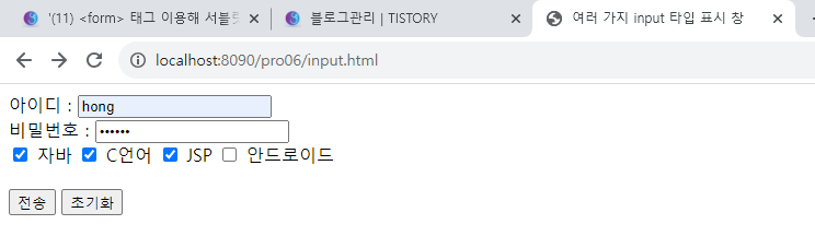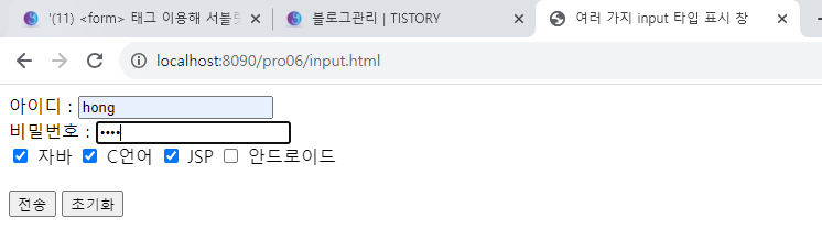 4. 브라우저에서 http://localhost:8090/pro06/input.html로 요청하고 값을 입력한 후 전송을 클릭한다. getParameterValues()를 이용해 전송된 name과 값이 모두 출력되는 것을 확인할 수 있다.