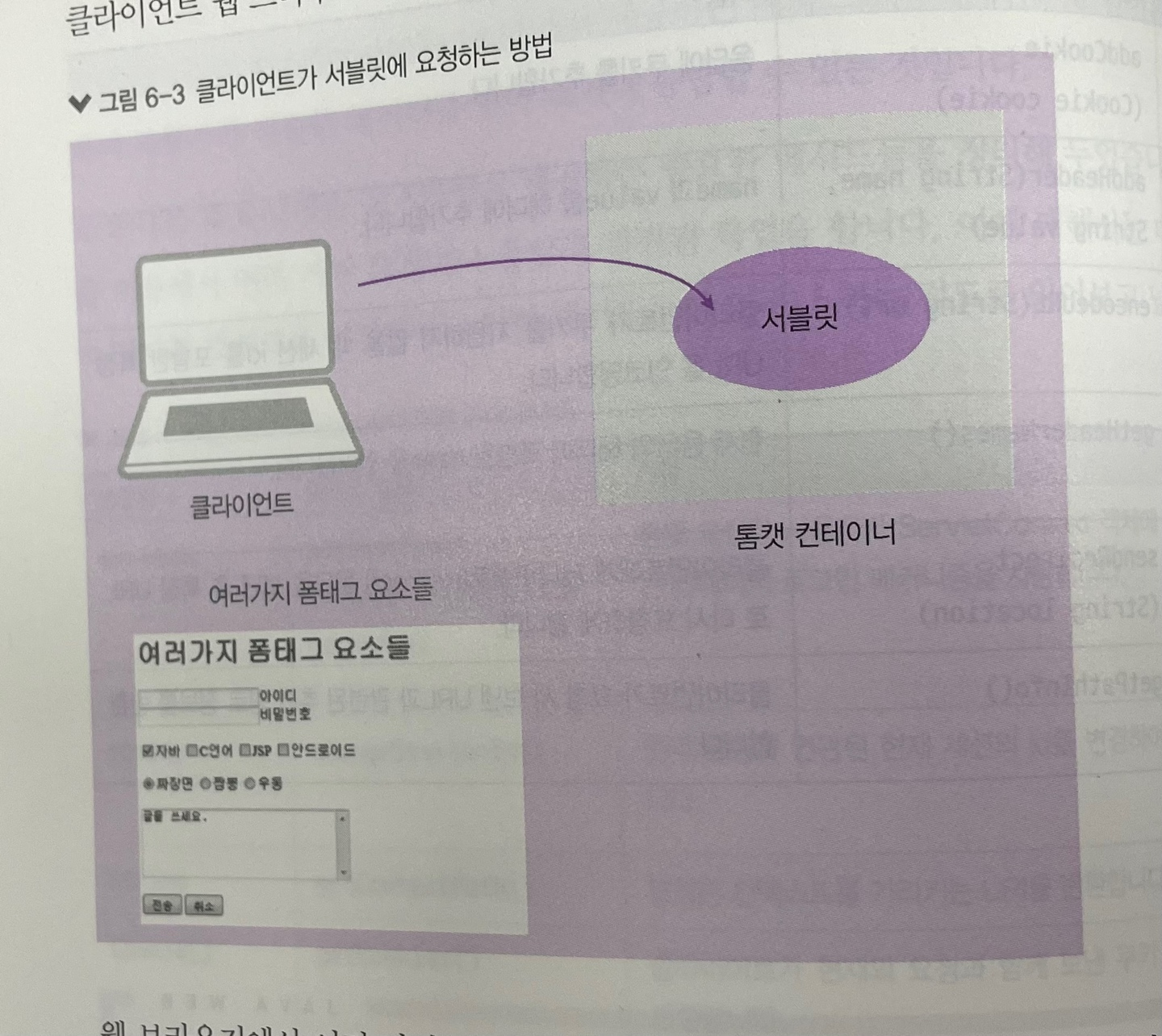 * JSP, ASP, PHP가 나오기 전에는 HTML, CSS, 자바스크립트를 이용해 웹 프로그램을 만들었다. 서블릿과 JSP는 이러한 HTML, CSS, 자바스크립트 같은 기존의 것을 버리는 것이 아니라 여기에 자신의 기능을 추가하여, 즉 서로 연동하여 동작한다. 특히 사용자의 요청은 HTML <form> 태그나 자바스크립트로부터 전송 받아서 처리한다.