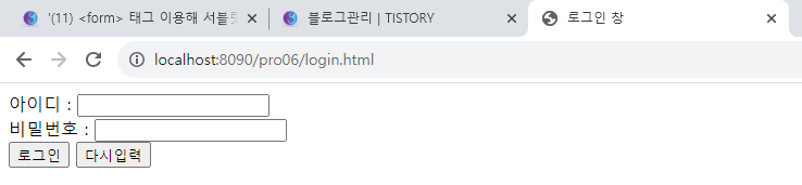 6. pro06 프로젝트를 톰캣에 등록하여 실행한 후 브라우저에서 http://localhost:8090/pro06/login.html을 요청한다.
