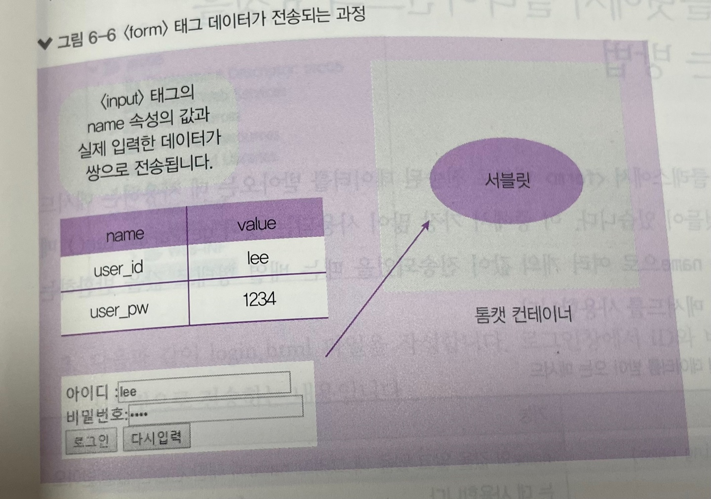 * 사용자가 자신의 ID와 비밀번호를 입력한 후 로그인을 클릭하면 <form> 태그의 action 속성은 데이터를 전송할 서블릿이나 JSP의 이름을 지정한다. 그러면 지정된 이름이 login인 서블릿으로 ID와 비밀번호를 전송한다.