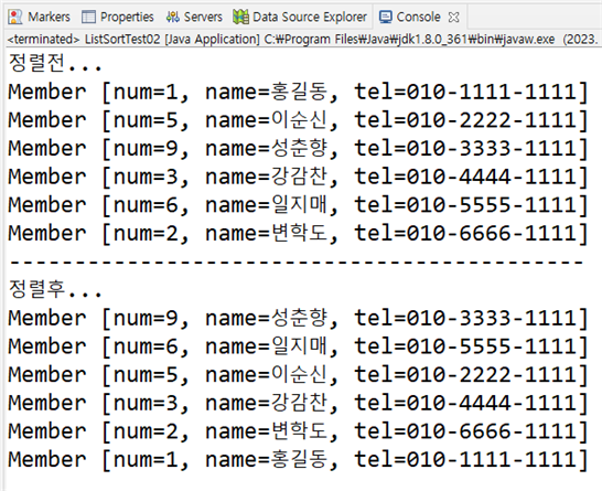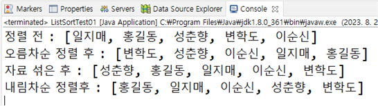 System.out.println("오름차순 정렬 후 : " + list); // 오름차순 정렬 후 : [변학도, 성춘향, 이순신, 일지매, 홍길동]