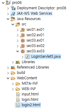 1. 다음과 같이 sec03.ex03 패키지에 LoginServlet5 클래스를 생성하고 login2.html을 추가로 생성한다.