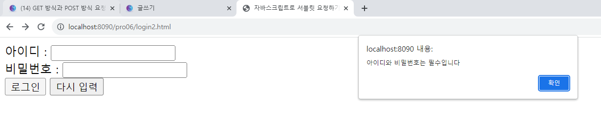 4. http://localhost:8090/pro06/login2.html 로 요청한다. ID와 비밀번호를 입력하지 않고 로그인을 클릭하면 오류 창이 나타난다.