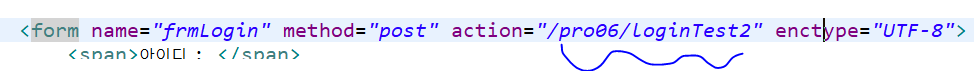<form name="frmLogin" method="post" action="/pro06/loginTest" encType="UTF-8"> <!-- test01 폴더에 위치한 HTML에서 서블릿에 요청하므로 action 속성에서 서블릿 매핑 이름 앞에 프로젝트 이름 /pro06을 붙여주어야 한다. -->