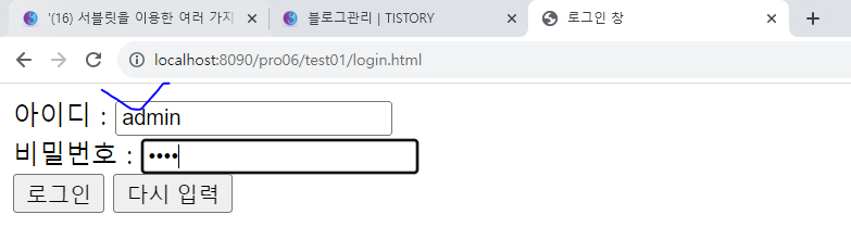 3. http://localhost:8090/pro06/test01/login.html 로 요청한 후 ID를 admin으로 입력한 후 로그인을 한다.