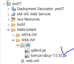 새 프로젝트 pro07을 생성한 다음 오라클 데이터베이스와 연동하는 데 필요한 드라이버인 ojdbc6.jar를 프로젝트의 /WebContent/WEB-INF/lib 폴더에 복사하여 붙여 넣는다.