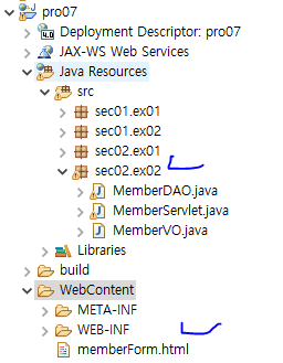 7. sec01.ex01 패키지를 만들고 회원 조회와 관련된 자바 클래스 파일인 MemberDao, MemberServlet, MemberVO 클래스를 각각 생성한다.