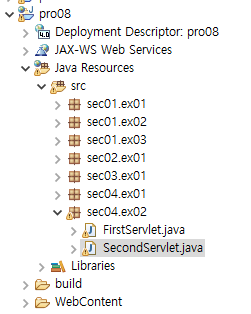 1. sec03.ex01 패키지에 다음과 같이 두 개의 서블릿 클래스를 추가한다.