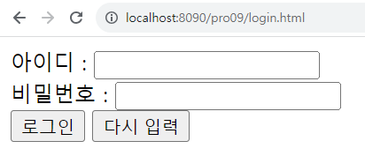 4. http://localhost:8090/pro09/login.html 로 요청하고 ID와 비밀번호를 입력한 후 서블릿으로 전송한다.