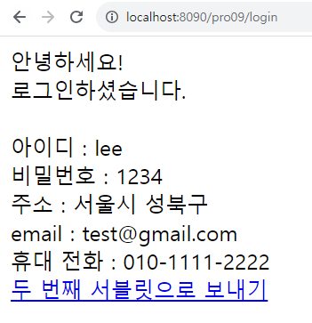 5. 첫 번째 서블릿에서 전달받은 로그인 정보를 출력한 후 두 번째 서블릿으로 보내기를 클릭한다.