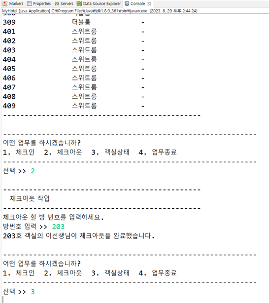 System.out.println(roomNum + "호 객실의 " + guestName + "님이 체크아웃을 완료했습니다.");