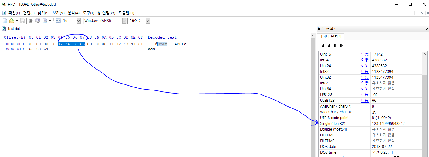 dout.writeFloat(123.45f); // 실수형(float)으로 출력