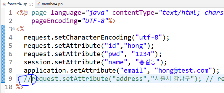 4. 이번에는 forward4.jsp에 request에 바인딩하는 부분을 주석 처리한다.