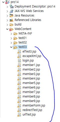1. 프로젝트의 WebContent 디렉터리 하위에 test03 디렉터리를 만들고 실습에 관련된 JSP 파일을 만든다.