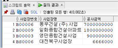 -- <문제4> 공사가 끝난 사업장중 공사금액이 큰 순서로 사업장번호, 사업장명, 공사금액을 구하시오.