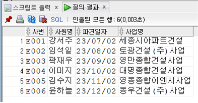 VALUES ('E001', '강서주', '세종시 다정남로 22', '010-8317-9503', '사원', '건설과') -- 기준점
