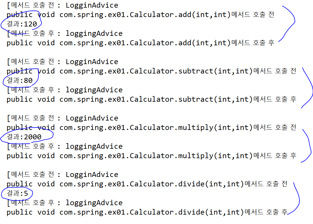 cal.divide(100, 20); // 메서드 호출 전후에 어드바이스 빈이 적용된다.