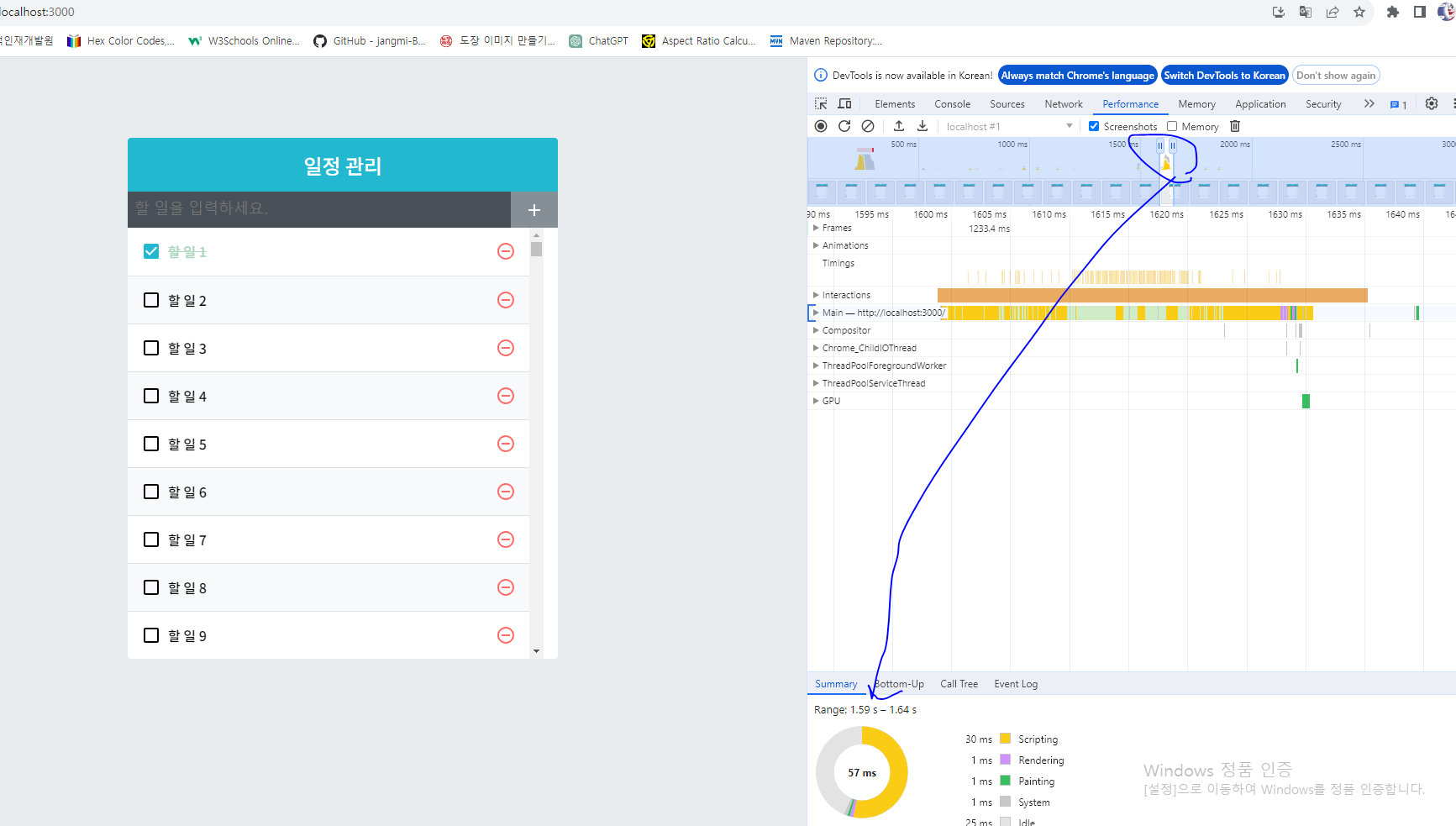 * 지금까지 리액트 컴포넌트 리렌더링 성능을 최적화하는 방법을 알아 보았다. 리렌더링 성능을 최적화할 때는 필요한 때만 리렌더링하도록 설정해 주었다. 이번에는 또 다른 렌더링 성능 최적화 방법을 알아보자. 일정 관리 애플리케이션에 초기 데이터가 2,500개 등록되어 있는데, 실제 화면에 나오는 항목은 아홉 개 뿐이다. 나머지는 스크롤해야 볼 수 있다.