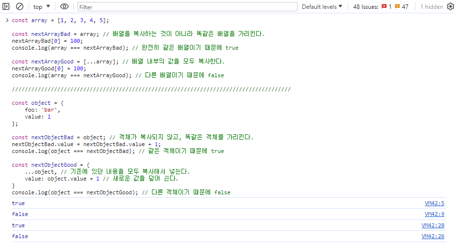console.log(array === nextArrayGood); // 다른 배열이기 때문에 false