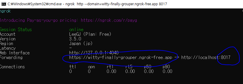 * NGROK? : 무료 도메인(1개만 무료로 쓸 수 있음), https를 사용할 수 있다.