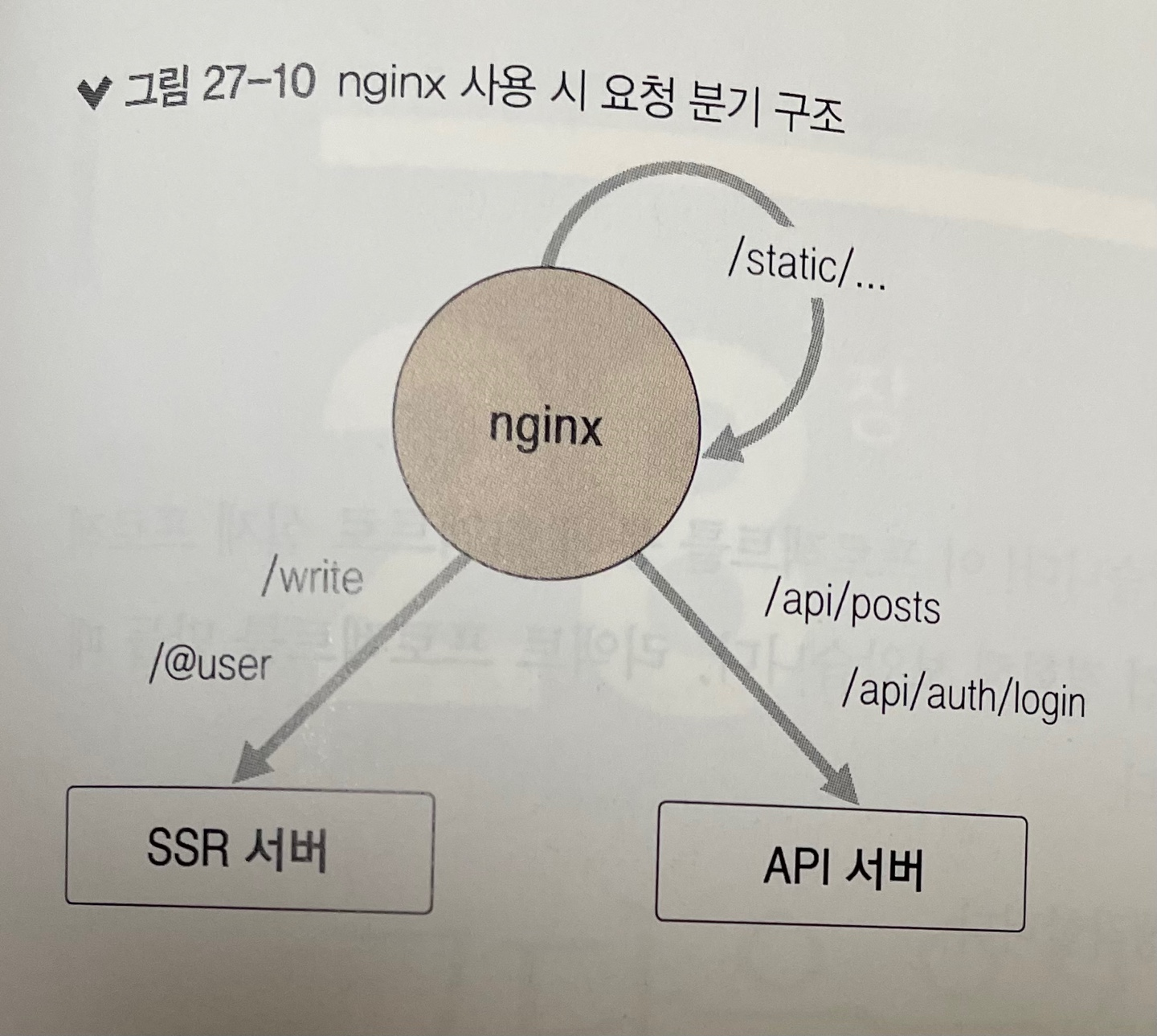 * 그리고 이전에 배운 것처럼 서버 사이드 렌더링을 적용하고, 서버 컴퓨터에서 두 종류의 서버를 구동해야 한다. 하나는 API 서버이고, 다른 하나는 서버 사이드 렌더링 전용 서버이다. 그리고 ngnix를 사용하여 사용자가 요청한 경로에 따라 다른 서버에서 처리하게끔 하면 된다. 또한, ngnix를 사용하는 경우에는 정적 파일 제공을 Node.js 서버가 아닌 ngnix 자체적으로 처리하는 것이 성능상 더 빠르다.