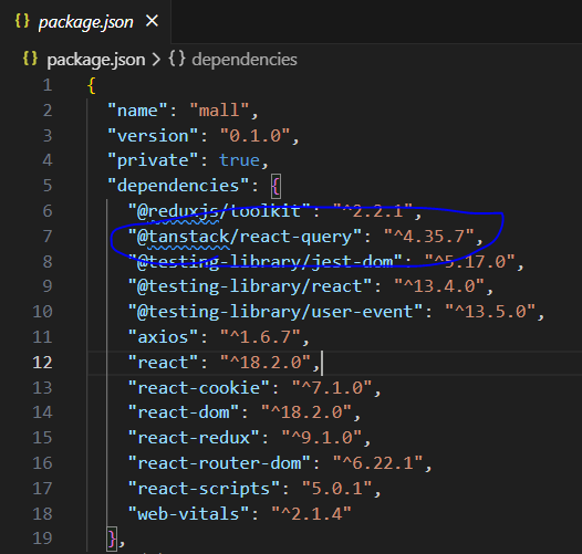 * 리액트 쿼리 개발 시에는 개발도구를 같이 설치해서 사용하는 것이 편리하므로 아래 CLI를 통해 추가한다. 추가된 라이브러리는 package.jsom을 통해서 확인한다.