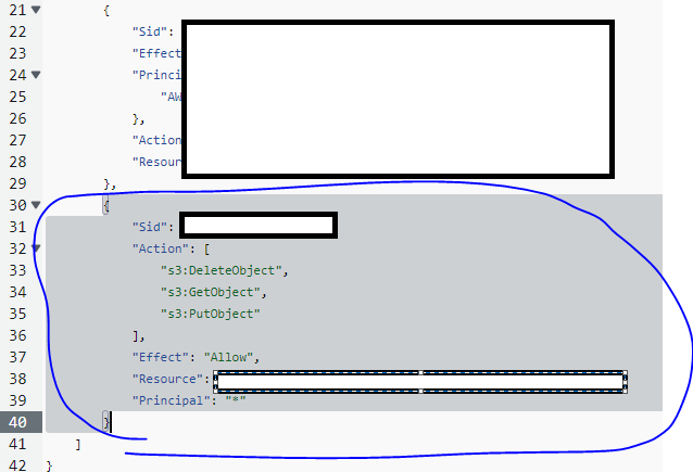 * 버킷 정책에서 새 문 추가를 이용해서 생성된 JSON 문자열 중 Sid로 생성되는 항목부터 추가하도록 수정한다.
