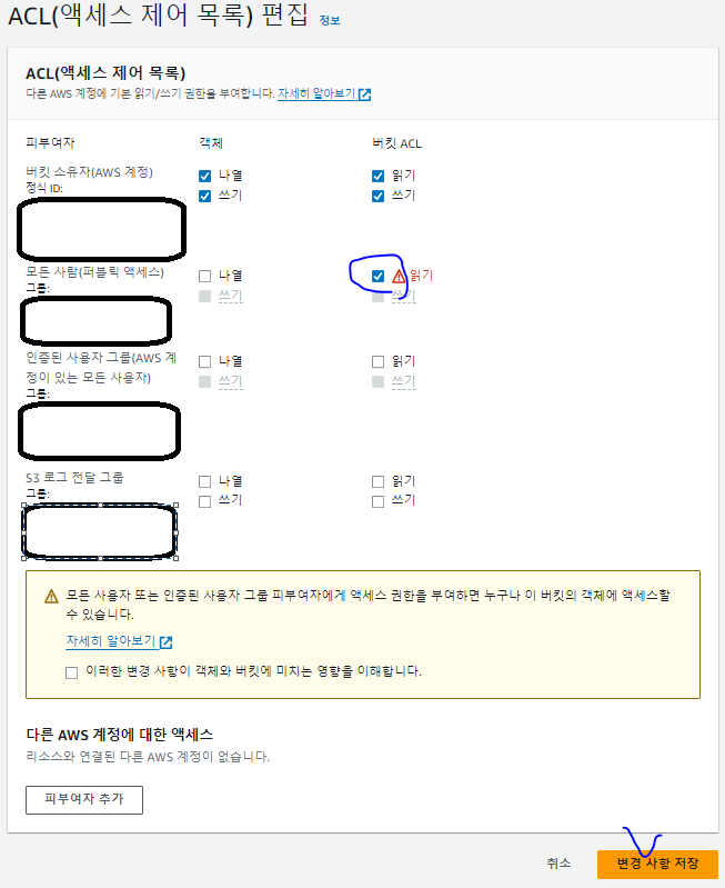 * 외부에서 해당 S3에 있는 파일들을 보기 위해서 버킷의 속성에서 ACL을 편집한다.