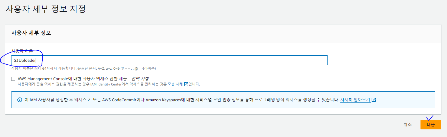 * S3 버킷에 직접 파일을 업로드하는 작업은 가능하지만, 이를 프로그램을 통해서 처리하기 위해서는 사용자를 생성하고 사용자가 가지는 액세스 키(access key), 비밀 엑세스 키(secret access key) 등을 사용해야만 한다.