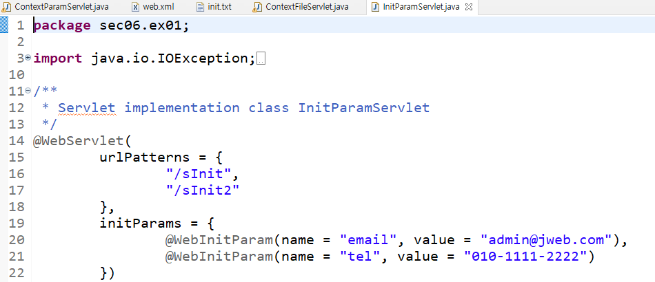@WebInitParam(name = "tel", value = "010-1111-2222") }) // @WebInitParam을 이용해 여러 개의 매개변수를 설정할 수 있다.