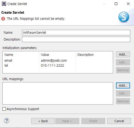 * 이클립스에서 서블릿을 생성할 때 @WebServlet의 값들을 편리하게 설정할 수 있다. @WebServlet으로 서블릿을 생성할 때 사용할 매개변수를 설정해 보자.