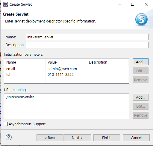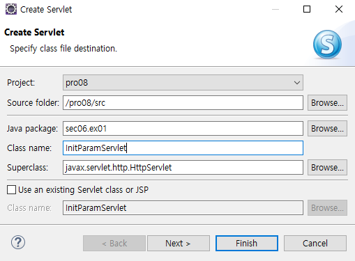 2. 클래스 이름으로 InitParamServlet을 입력한 후 Next를 클릭한다.