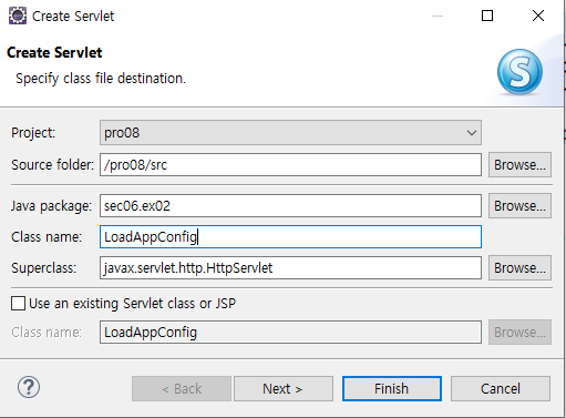 <servlet-class>sec06.ex02.LoadAppConfig</servlet-class> <!-- 패키지 이름까지 포함된 서블릿 클래스 이름을 설정한다. -->